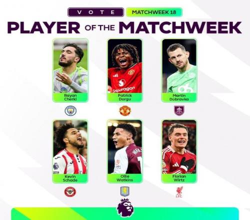 英超官方公布了英超第18轮周最佳球员候选名单,其中候选六人为谢尔基、多古、马丁·杜布拉夫卡、凯文·沙德、沃特金斯、维尔茨。