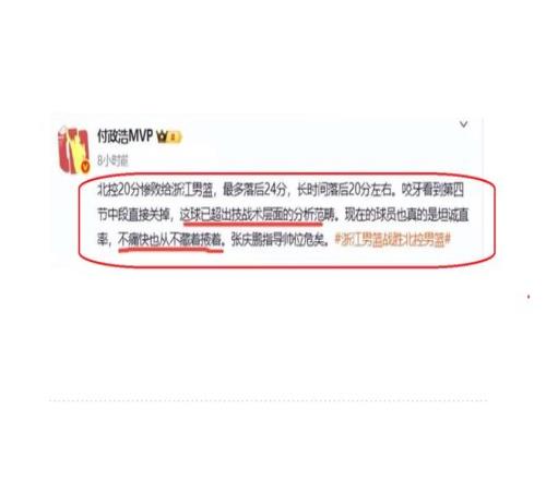 付政浩这话,可以说是讲得十分清楚,那就是北控队球员在场上,就是不想打球,不想赢球,完全没有赢球的心态,变得完全没有底线,真的是不可理喻。同时,主教练张庆鹏,对这支球队也是完全失去了控制。为此,付政浩认为现在北控队唯一的解决办法,就是让张庆鹏下课。