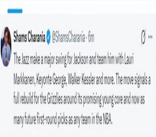 北京时间2月4日凌晨,根据ESPN记者Shams的报道,爵士队与灰熊队达成交易,小贾伦-杰克逊将被交易到爵士队换取三个首轮签。
